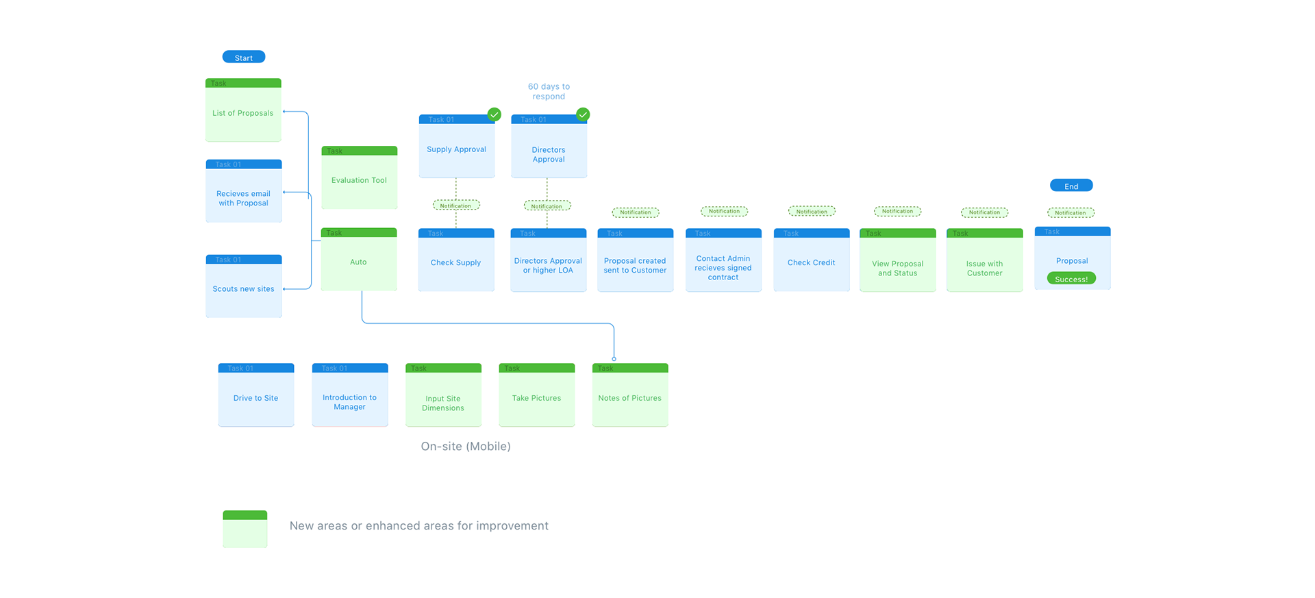 We identified and created 13 personas that the current process touches but we decided to focus on only one persona, the TSM "Territory Sales Manager". We found that the TSM was responsible for starting the entire process, capturing most of the data, on-site evaluations, site economic analysis, and ultimately deciding whether the site was worth the companies time. (...we found they did a lot)